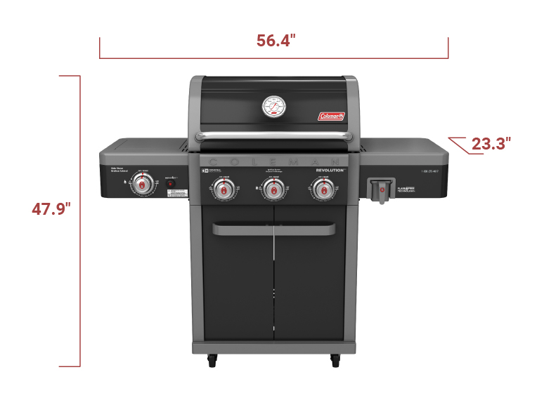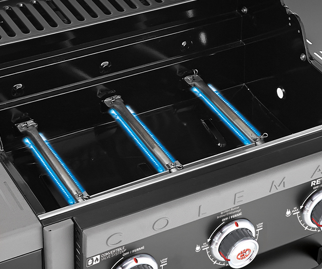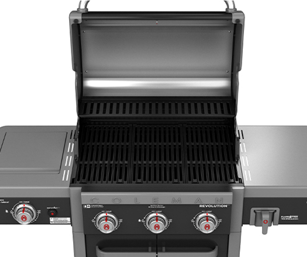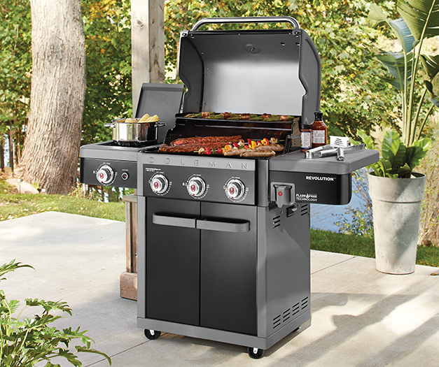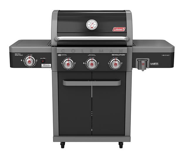 This barbecue also features a stainless-steel side burner for outdoor sauce and side dish preparation. The Coleman Revolution™ 3-Burner barbecue includes the Convertible Valve System™ for easy conversion from propane to natural gas (Conversion kit sold separately - 085-2261).